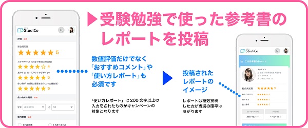 『StudiCo』へ無料会員登録(メールアドレス登録必須)の上、受験勉強で実際に使った参考書の使い方レポートを投稿し、期間中に応募フォームよりエントリーしていただいた方の中から、抽選で100名様に賞品「Amazonギフト券(Eメールタイプ)2,000円分」をプレゼント。