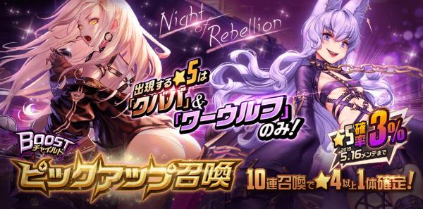 ワールドボス・トライアルのBOOSTチャイルドとなる新★5チャイルド「クババ(CV:高乃麗/清水彩香)」と★5チャイルド「ワーウルフ(CV:花守ゆみり)」をピックアップしたNight of Rebellionピックアップ召喚を開催!