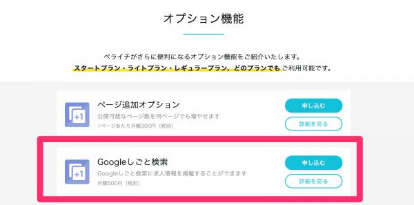 オプション機能欄から、「Googleしごと検索」の「申し込む」をクリックします。