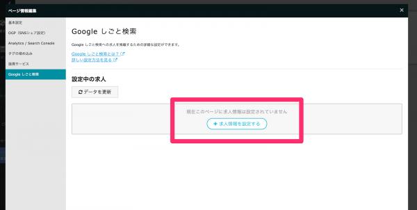 ページ編集画面の「ページ情報編集」の左側メニューから「Googleしごと検索」タブを選択します。「求人情報を設定する」をクリックすると別タブで求人情報入力フォームが開きます。