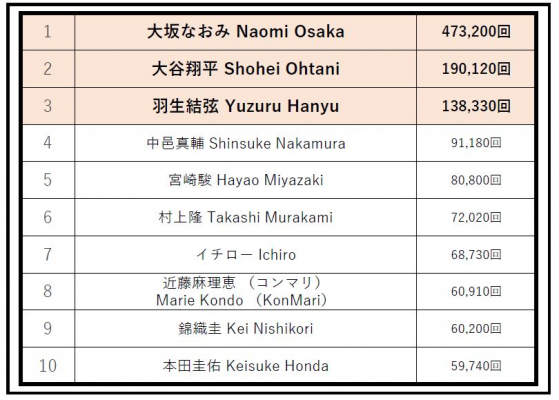 (2) 検索数が一番多かったのは大坂なおみ。昨年9月の全米オープン優勝をはじめ、数えきれないほどの活躍からも納得の結果である。