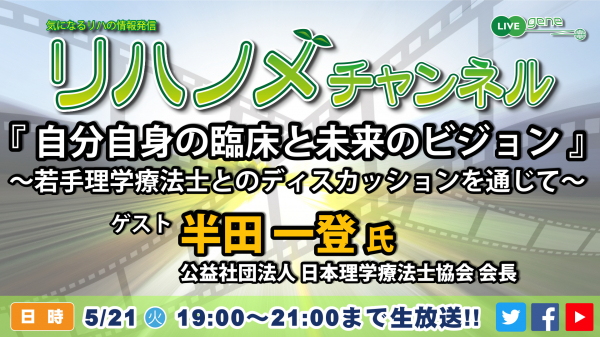 5/21(火)19時より放送 日本理学療法士協会 半田 一登 会長ご出演『「自分自身の臨床と未来のビジョン 」〜若手理学療法士とのディスカッションを通じて〜 』