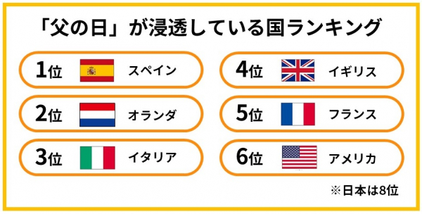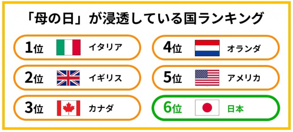 結果を見ると、「母の日」が最も浸透している国はイタリア、「父の日」が最も浸透している国はスペインとなり、ランキング上位はヨーロッパ圏の国々が占める形となりました。一方日本は、「母の日」6位、「父の日」8位という結果に!日本も、父母想いの国の一つと言えるかもしれません。