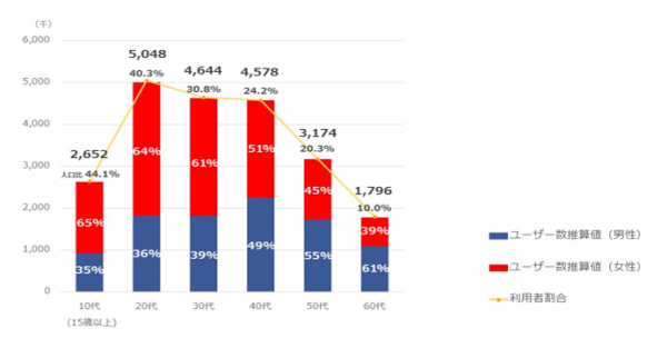 インスタグラムのユーザーの男女比は、10代〜30代は男性4割:女性6割です。女性ユーザーが多いことから、女性目線での“映え”る写真の提案や運用プラン作成を行ってまいります。