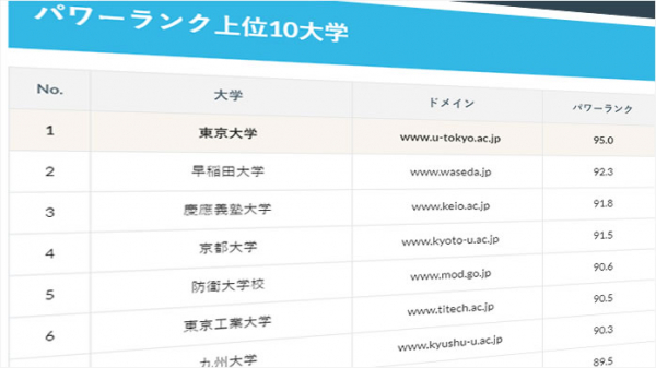大学のWebサイトの中には、最も歴史があるドメインで1993年にドメイン取得し26年経過しているドメインもあり、長期間のサイト運用と、公共性や情報の有用性等から他のWebサイトよりリンクを得られることも多いことからパワーランクが高い傾向にあると考えられます。