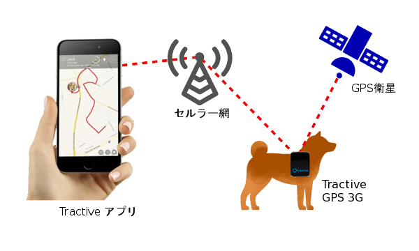 首輪に取り付けるだけで GPS衛星を補足し座標情報を取得、セルラー網を通じて位置情報としてTractiveサーバーに登録されます。 ペットの居場所は、スマートフォンのTractiveアプリから登録された情報を参照することで、リアルタイムに確認することができます。