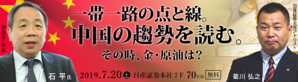 日産証券(東京/中央区)では7月20日(土)、東京都中央区日本橋蛎殻町の日産証券本社を会場にセミナーを開催。チャイナ・ウオッチャーとして評価の高い石平(セキ・ヘイ)氏をゲスト講師に、アジア各所に招かれ各国の取引所主催、共催セミナーでの招待講師も務める当社主席アナリスト菊川弘之による2部構成。「爪を隠せ」、かつて鄧小平氏が提唱の”韜光養晦(とうこうようかい)”政策から習近平政権の”一帯一路”への変節の裏側と覇権戦争下で揺れる金・原油市場の行方を詳解。「一帯一路の点と線。中国の趨勢を読む。〜その時、金・原油は?〜」このセミナーに70名様(要事前申込み)を無料ご招待!!