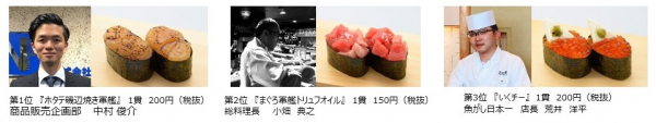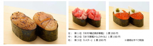 今回投票で選ばれて期間限定で提供するのは、『ホタテ磯辺焼き軍艦』 『まぐろ軍艦トリュフオイル』 『いくチー』の3品です。