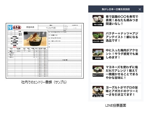 全150品の応募メニューは、一次審査として本部での書類選考を行って12品に絞りました。そして、二次審査は選ばれた12品の寿司を作って試食会を行って、10品までを選出しました。そして最終審査として、選ばれた10品を「立喰い寿司 魚がし日本一」のLINE会員41,703人に投票を募りました。
