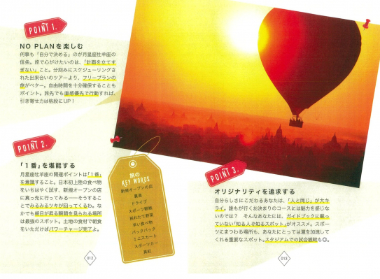 運を引き寄せるために一番重要なことは「行動」すること。その点、旅に出ることは行動そのもの。旅こそは、自分の生まれ持った才能をより高めてくれる最高の開運アクションというKeikoさんが、自分の月星座を使う「月星座別引き寄せ旅」と、願いを叶える「新月と満月に合わせた旅」のメソッドを、国内外の観光スポットとともに紹介しています。