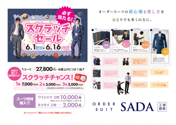 期間、オーダースーツSADA全店舗(ネットショップは除く)でスクラッチセールを開催致します。