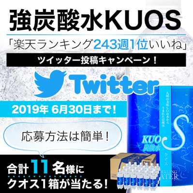 株式会社 OTOGINO(オトギノ:社長 鬼武公洋 本社 大分県日田市北友田 2 丁目 2123 番地 1)が E-コマースにて販売している主力商品、うまさを感じる強炭酸水『KUOS-クオス-』楽天市場ランキング(水・ミネラルウォーター/発泡部門)243週1位を記念して、ツイッターキャンペーンを実施します。キャンペーン期間中Twitterで「 #強炭酸水KUOS楽天ランキング243週1位 」をリツイートすると、抽選でKUOSが合計243本以上(1箱24本入り、11名)が貰えるキャンペーンを実施します。