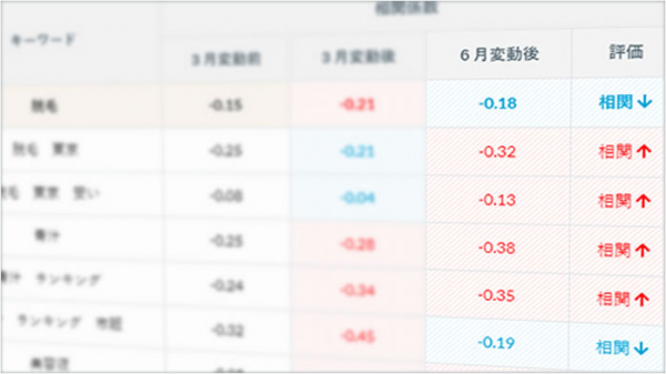 キーワード毎の相関係数やパワーランク相場の推移(3月変動前、3月のコアアルゴリズムアップデート後、6月のコアアルゴリズムアップデート後)につきましては、以下よりご覧下さい。