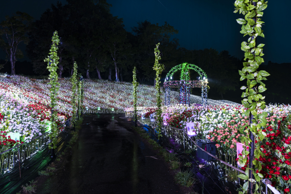ライトアップされた花畑やバラのイルミネーションなど、