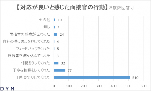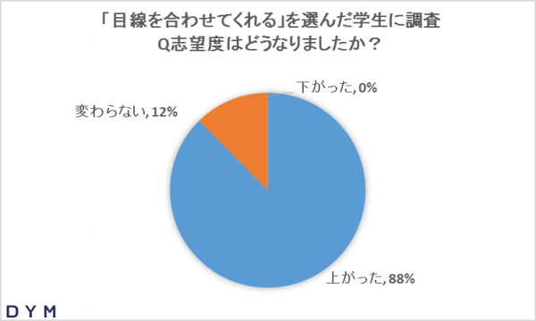 その中で、好印象を持った面接官の対応を調査したところ、「目を見て話してくれた」が圧倒的な1位回答となりました。また、「目を見て話してくれた」を選択した学生に、その企業への入社志望度の変化を調査したところ、約9割が「志望度が上がった」と答えました。