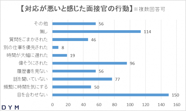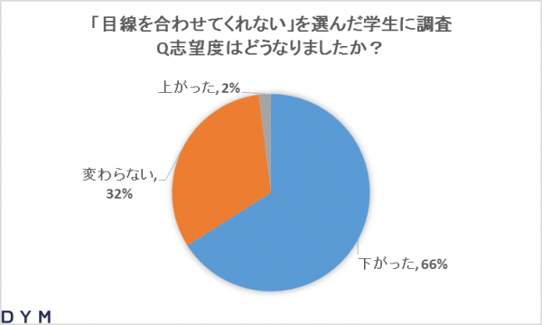 逆に、悪印象の面接官の対応1位は「目を合わせてくれなかった」となりました。「目を合わせてくれなかった」を選択した学生に、その企業への入社志望度の変化を調査したところ、約7割が「志望度が下がった」と答えました。