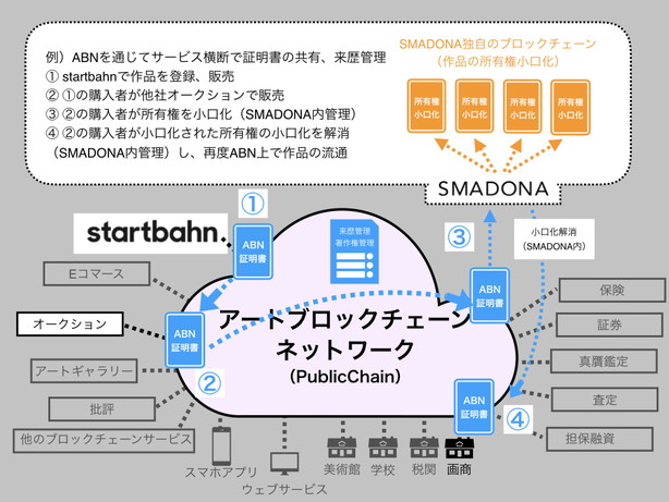 またABNは他のブロックチェーンプロジェクトと接続し運用できる点が大きな特徴です。本プロジェクトはABNをSMADONAが提供予定の所有権分割サービスと連携し、作品の来歴管理や著作権管理、小口化された作品の再流通を可能とする取り組みを進めてまいります。