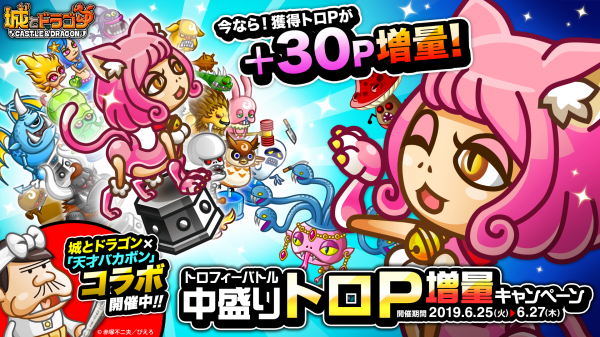 株式会社アソビズム(本社:東京都千代田区、代表取締役:大手智之)は、App Store・Google Playにて好評配信中の『城とドラゴン』で、「トロフィーバトル 中盛りトロP増量キャンペーン」を2019年6月25日(火)より開催いたします。通常よりもトロPを獲得しやすくなっているので、挑戦してトロフィーGETを目指しましょう!