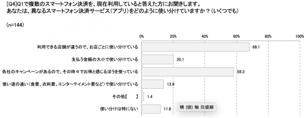 また、同調査で決済サービスをどのように使い分けているかについてもアンケートを取ったところ、一番多かった回答が「利用できる店舗が違うので、お店ごとに使い分けている」で68.1%でした。次に多かった回答が「各社のキャンペーンがあるので、その時々でお得と感じるほうを使っている」で58.3%でした。 この結果に対しSSL所長の安田は「キャンペーンを利用し、キャンペーン終了後も継続してサービスを利用していることがこの調査でわかり、キャンペーンの有効性が明らかになりました。しかし、ユーザーが増えても加盟店が少なければスマホ決済サービスは使われることはありません。つまり、決済事業者はユーザーと加盟店を同時に増やす必要があります。今後も様々なキャンペーンや、連携・提携といった顧客・加盟店争奪戦が展開されるでしょう」と見解を述べています。