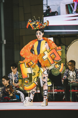 マンガによく用いられる擬音語に注目し、風神雷神を意識した「赤い首飾り」には「日本元気プロジェクト」のメインイベントにおいて象徴的に用いられる和太鼓のパフォーマンスからインスパイアされた「ドンッ」「ガッ」を、ヘッドピースには、「モデルが着用したときにハッピーになる衣装を」との山本寛斎氏のアドバイスのもと、恋をしたときの胸が跳ね上がるような衝撃を表現した「ズキュン」を取り入れた。また、少女マンガで特徴的な大きな目を表現すべく、手書きで書き起こしてオリジナルの目の柄の布を使い、タイツを作成。タイツにすることで、ピタッと体のラインを出しながらも動きやすさや着心地を追求したトレンドにこだわった。