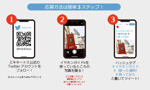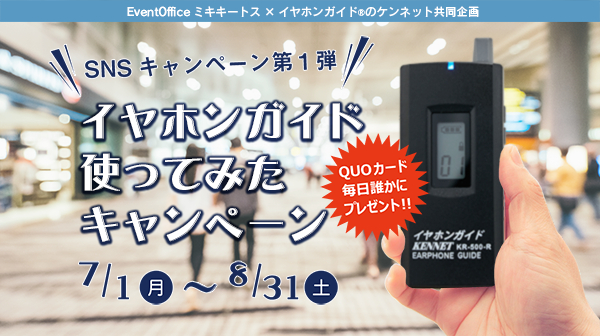 当キャンペーンでは、EventOfficeミキキートスTM企画・運営のツアーに参加し、実際に使用したお客様がTwitterで「イヤホンガイド」の写真を指定のハッシュタグをつけて投稿することで応募が完了、期間中毎日1名様に500円分の「令和」QUOカードが、毎週1名様に1,000円分のQUOカードが当たります。