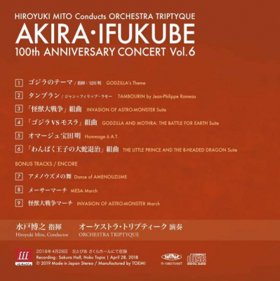 宝田明の指揮による「ゴジラのテーマ」を収録! 伊福部昭百年紀Vol.6の伝説のライブがCD化! 伊福部マーチ愛好者に捧ぐ「怪獣大戦争」組曲「わんぱく王子の大蛇退治」組曲が待望のCD化!