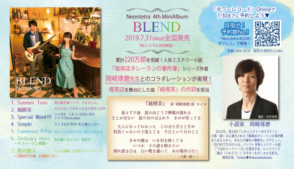 累計220万部「珈琲店タレーランの事件簿」著者・岡崎琢磨氏の作詞楽曲『純喫茶』をNeontetraのアルバム『BLEND』に収録決定!予約スタート!