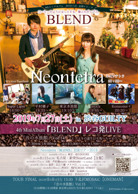 本作『BLEND』の発売を記念し、2019年7月27日(土)に、ライブハウス・渋谷ギルティでCD発売記念ライブを開催、以降、全国ツアーを行います。さらに、本作は全国各地のCDショップ店頭や、インターネット通販等で、予約を開始いたしました。