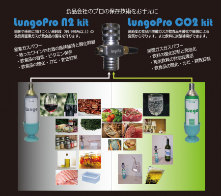 食品会社における製造、保存、包装の過程で、風味を維持しながらの酸化防止が必要な食品(例えばワイン、緑茶、コーヒー豆、削り節、チーズ、魚、菓子など)には固体や液体に溶けにくい性質を持つ高純度の食品用窒素ガスが、またハムやフランクフルト、カステラ、アーモンドやピーナッツなどには酸化抑制とともに静菌や防虫作用の強い食品用炭酸ガスが使用されています。ルンゴプロキットは飲食品を新鮮に保つための食品会社のプロの技術をお手元で実現します。