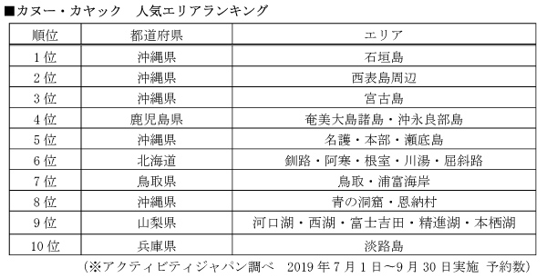 アクティビティジャパンでは2019年7月26日(金)迄の最新予約データを元に、2019年最新の「カヌー・カヤック」の人気スポットをランキングで紹介します。
