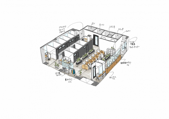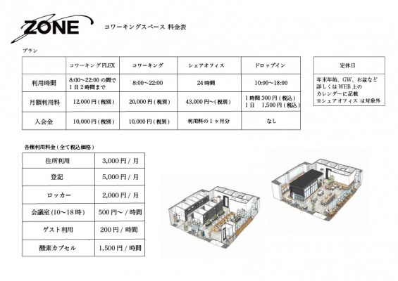 コワーキングスペース「ZONE」は、テーマ別に2つのフロアを利用した施設になっており、現在社会問題となっている、働き方改革、生産性の向上、業務の効率化などの問題解決をコンセプトに、お客様に働きやすい環境を提供します。