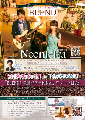 Office La Mer(以下、オフィス ラメール)は、進化系90年代テイスト・ポップスバンド「Neontetra(ネオンテトラ)」の4作目のミニアルバム『BLEND(ブレンド)』を、2019年7月31日(水)に全国発売いたしました。発売を記念した「『BLEND』全国ツアー2019」を、東京・大阪・名古屋・福岡など6都市で開催し、ツアーファイナル公演としてのワンマンライブを9月8日(日)に「下北沢MOSAiC」(東京都世田谷区)で開催することを発表いたします。チケットは、「Neontetra」のオフィシャルサイトにて本日より販売開始いたします。