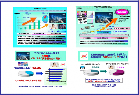 5G関連製品サービスの中でとくに注目されるXR(VR/AR/MR)ビジネスの市場性について調査したところ、XRデバイスはエンターテイメントなどの民生用途だけでなく、ソリューション、設計開発、トレーニングなどの産業用途が市場拡大傾向にあり、世界的に50〜70%の高成長を続け、5年後の2024年のグローバル市場は18兆円規模が予測される。2020年には東京五輪の開催も市場促進要因のひとつであるが、その他注目されるところでは、アップルまたはスタートアップ等の本格的ARデバイス(スマートグラス)の発売も予想される。現実空間と重ね合わせるコンテンツのクラウドサービス等の新潮流が予想されている。ビジネスマンへの意識調査では、日本の持ち味はアニメなどのコンテンツであり、バーチャルYouTuberなどの可能性が挙げられている。VR関連では360度動画、自由視点なども注目されている。