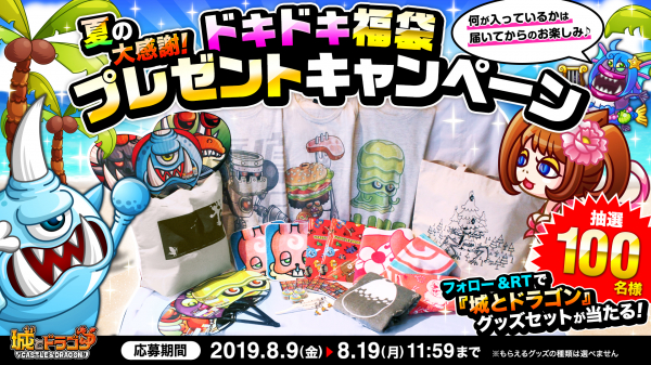 『城とドラゴン』「夏の大感謝!ドキドキ福袋プレゼントキャンペーン」2019年8月9日(金)よりTwitterで実施!中身は届いてからのお楽しみ♪