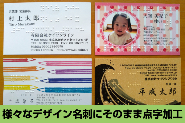 株式会社ケイワンプリント(本社:東京都新宿区、社長:丸山正紘、資本金:1,000万円、以下ケイワンプリント)は、就労継続支援B型事業所 ココロスキップ(本社:埼玉県越谷市、所長:大政マミ、以下ココロスキップ)と共同で、視覚障がいのある方も指で触って内容を読むことができるユニバーサルな名刺「点字名刺」の作成を共同で行い、「点字名刺」をより多くの人に知っていただく”名刺ダイバーシティプロジェクト”を2019年8月30日に発表します。