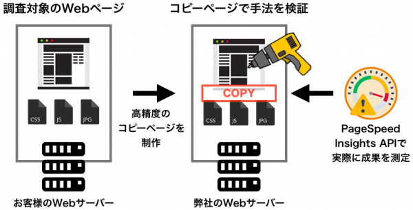 試してみなければわからないのであれば発想を転換して、低コストで総当りに手法を試す方法を模索したのが本サービス「PageSpeed改善リハーサル」です。