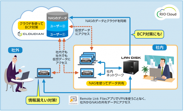 お客様PCにはデータが保存されず、クラウドに保存される仕組みのため、持ち出しPCの盗難・紛失に対しての情報漏洩対策やデータ消失、PC入替時のデータ移行、バックアップ、ランサムウェア対策など様々な対策が実現できます。またアイ・オー・データが提供する専用アプリでリモートから NAS共有データにもアクセスでき、インターネット接続があればどこでも同じ環境で業務を行うことができます。