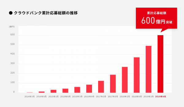 日本クラウド証券株式会社(本社:東京都港区、代表取締役社長:橋村純、以下「日本クラウド証券」)が募集の取扱いを行う「クラウドバンク」では、2013年12月のオープンから5年9ヶ月、2019年8月に応募総額600億円を突破いたしました。