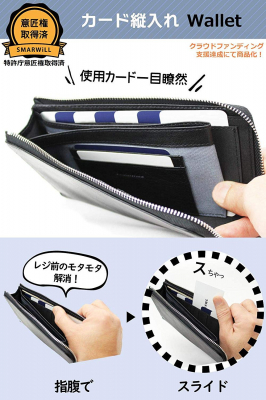 カード縦入れ仕様のスマートアクションウォレットは「使用カードが一目瞭然で、カードを指で滑らせるだけで取り出し可能!」