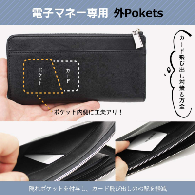 本体側面に「電子マネー専用ポケット」を付与。複数枚のカードと電子マネーを一緒にウォレットインせず「一度でカードが読み取られず、流れを止めてしまった!」といったことなくスムーズ決済ができます。