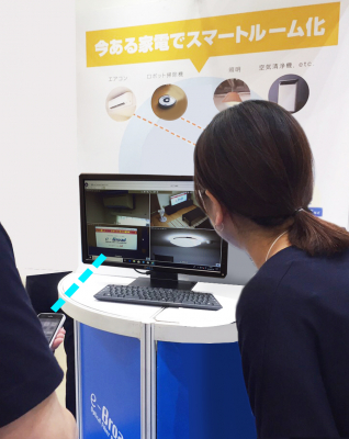 イーブロードのネットワーク防犯カメラシステムを使用して、実際に「e-Broad光マンション with IoT」を設置したお部屋をリアルタイム映像でモニタリングします。 フェア会場のスマートフォンから、照明やエアコン・TVなどリモコン操作が可能な家電製品の遠隔操作を行っていただき、実際に動いている様子をご体験いただけます。