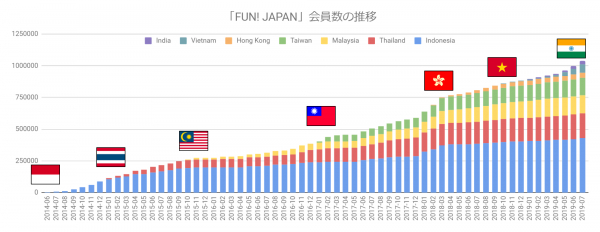 2014年6月にFUN! JAPANインドネシアをオープン。その後、タイ・マレーシア・台湾・香港・ベトナム・インドと拡大、2019年8月現在は7カ国を対象にしたアジア地域最大級(Facebook フォロワー数 各国合計約467万人、サイト会員数各国合計約100万人)のメディアに成長しました。