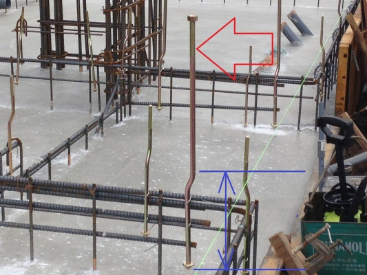 写真(左)着工直後の基礎工事で図面と違う金物が設置されている