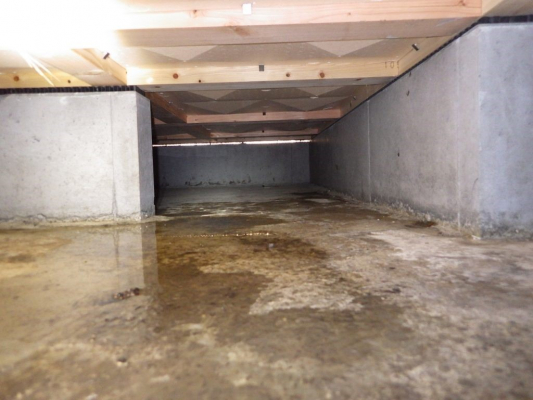 写真(右)完成間近なのに…設備からの漏水で床下に水が・・・