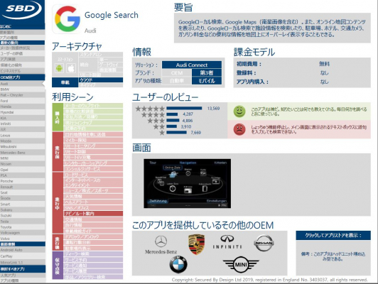 英国に本社を置き自動車技術に関する調査およびコンサルティングを手掛ける株式会社SBDジャパン(名古屋市)では、欧州、米国、中国における自動車向けアプリ市場の最新動向と各OEMが提供するアプリの詳細についてまとめたレポート「自動車向けアプリガイド 2019年8月版」を2019年8月19日に発行しました。