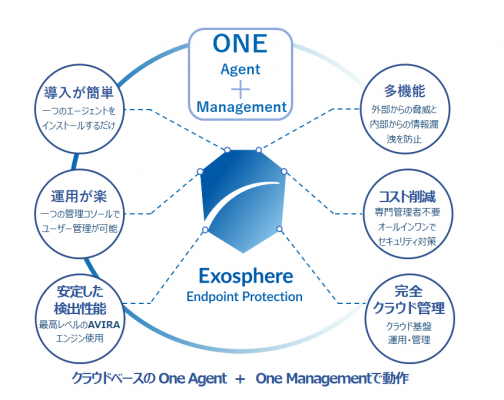 『Exosphere』は、端末にインストールする一つの『Agent』と、クラウドで運用状況を一元管理できる『Managementサーバ』で、外部脅威、内部脅威に対する複雑なセキュリティ対策を行うことができるセキュリティソリューションです。