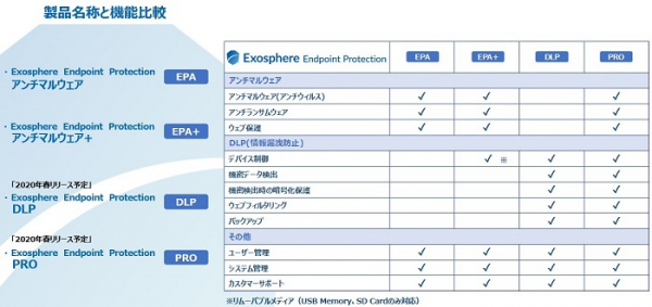 この度のリリースでは、PC向けのエンドポイントセキュリティ対策を行う『Exosphere Endpoint Protectionアンチマルウェア』と『Exosphere Endpoint Protectionアンチマルウェア+』を発売します。本ソリューションは、アンチマルウェア(アンチウイルス)、アンチランサムウェア、フィッシングサイト、不正アクセスデバイス制御等の外部脅威に対する保護を一つのソリューションでカバーすることができます。なお、2020年春発売予定の『Exosphere Endpoint Protection DLP』『Exosphere Endpoint Protection PRO』では特に情報漏えい防止の対策が為されております。『Exosphere Endpoint Protection PRO』に関しましては、アンチマルウェア(アンチウイルス)はもとより、ユーザー管理などセキュリティソリューションに関して必要な機能が全て網羅されている商品となります。