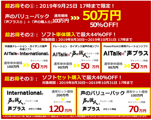 「AITalk International」 リニューアル記念キャンペーン開催! 9/25まで「声のバリューパック」が50%OFF 10/31まで日本語・外国語ナレーション作成ソフトが最大44%OFF