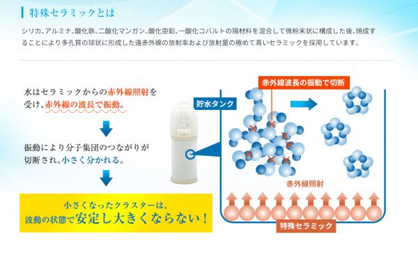 水はセラミックからの赤外線照射を受け、赤外線の波長で振動します。その振動により水の分子集団のつながりが切断されて、小さなクラスターに分かれます。一般的な水道水(H2O)のクラスターは15〜20程度ですが、リセラに搭載されているセラミックによるクラスターでは、2〜3程度に小さくなります。一般の水道水と比べると5〜10分の1くらいの小ささになります。