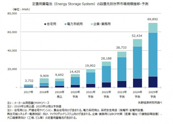 【矢野経済研究所プレスリリース】定置用蓄電池世界市場に関する調査を実施(2019年)〜2025年の定置用蓄電池(Energy Storage System)世界出荷容量を69,892MWhと予測〜